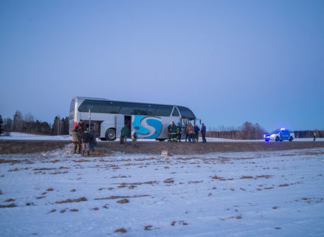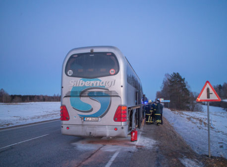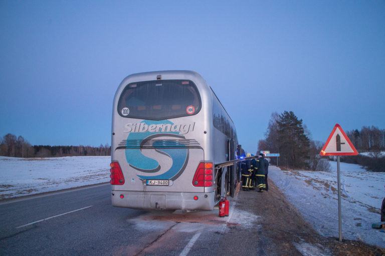 Läti numbrimärkidega ja põlemisjälgedega buss seisis Võru-Luhamaa maantee ääres. Reisijad olid bussist väljas.