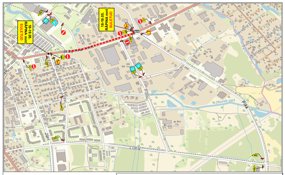 Tänav on sel ajal suletud skeemil näidatud ulatuses. Jälgida tuleb liikluskorraldusvahendeid.